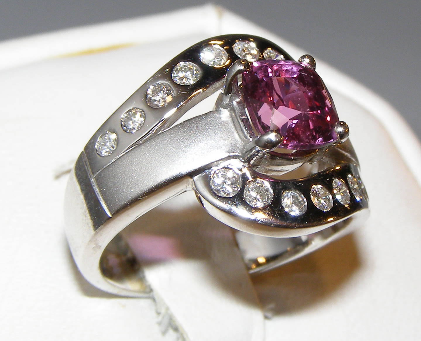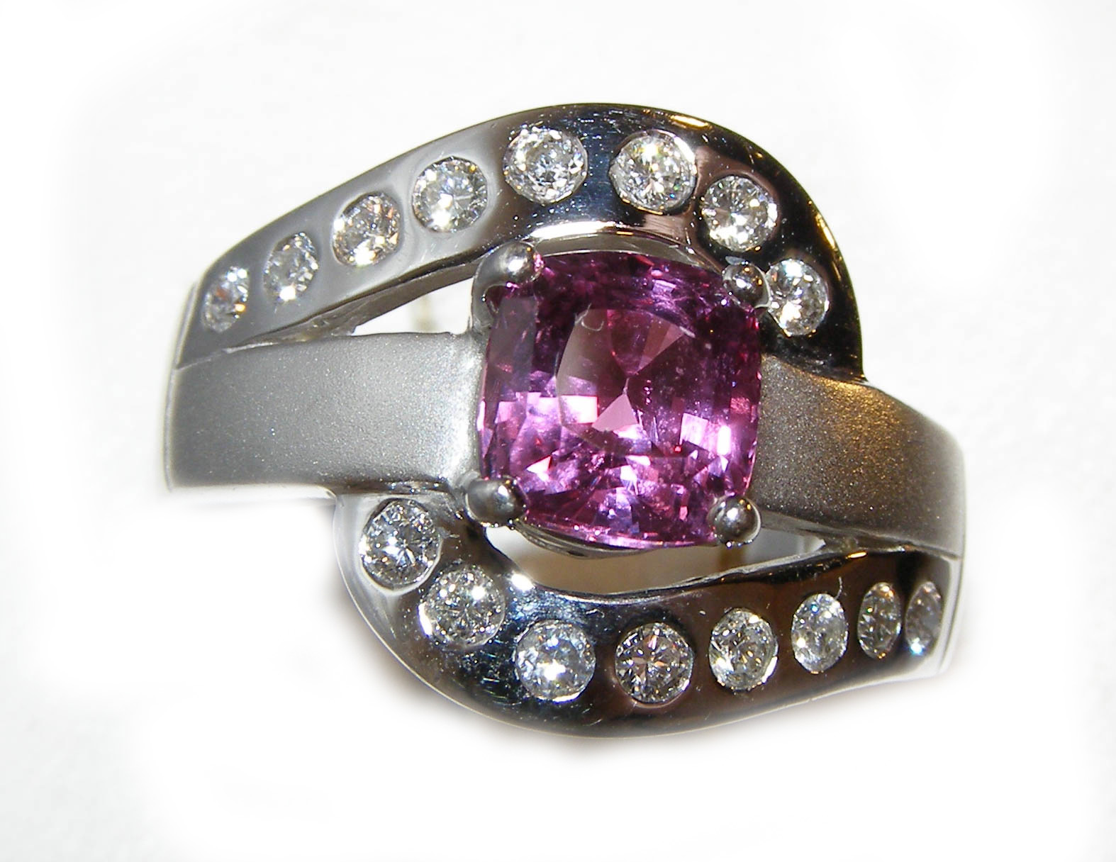 This contemporary styled ring showcases a high quality antique cushion cut pink sapphire that displays a strong pink color with secondary red hue. The sapphire measures 6.5 X 7.0 mm, weighs 1.50 carats, has excellent cutting and clarity (exceptionally clean for a pink sapphire) and wonderful brilliance filled with vivid flashes of raspberry color.
