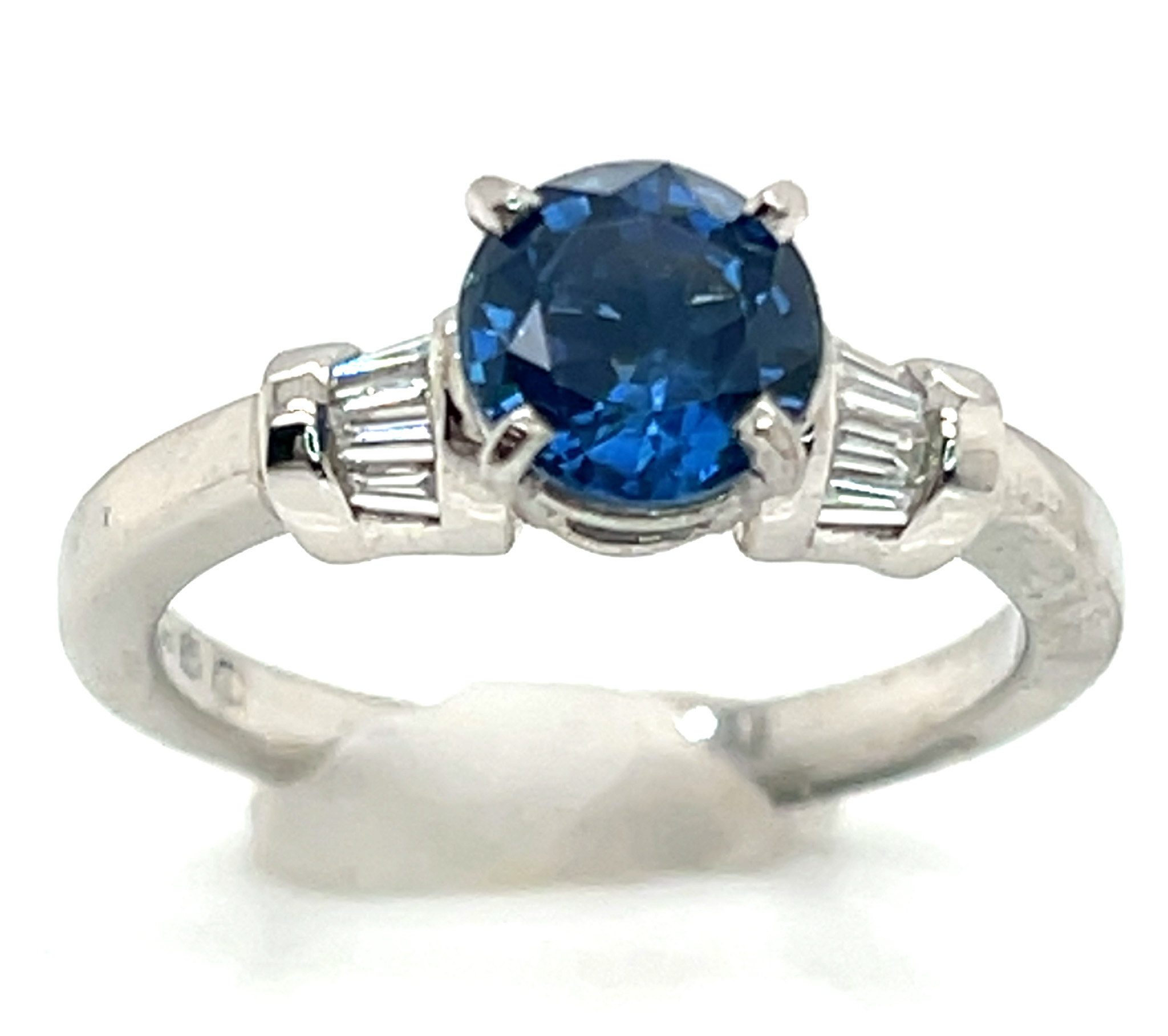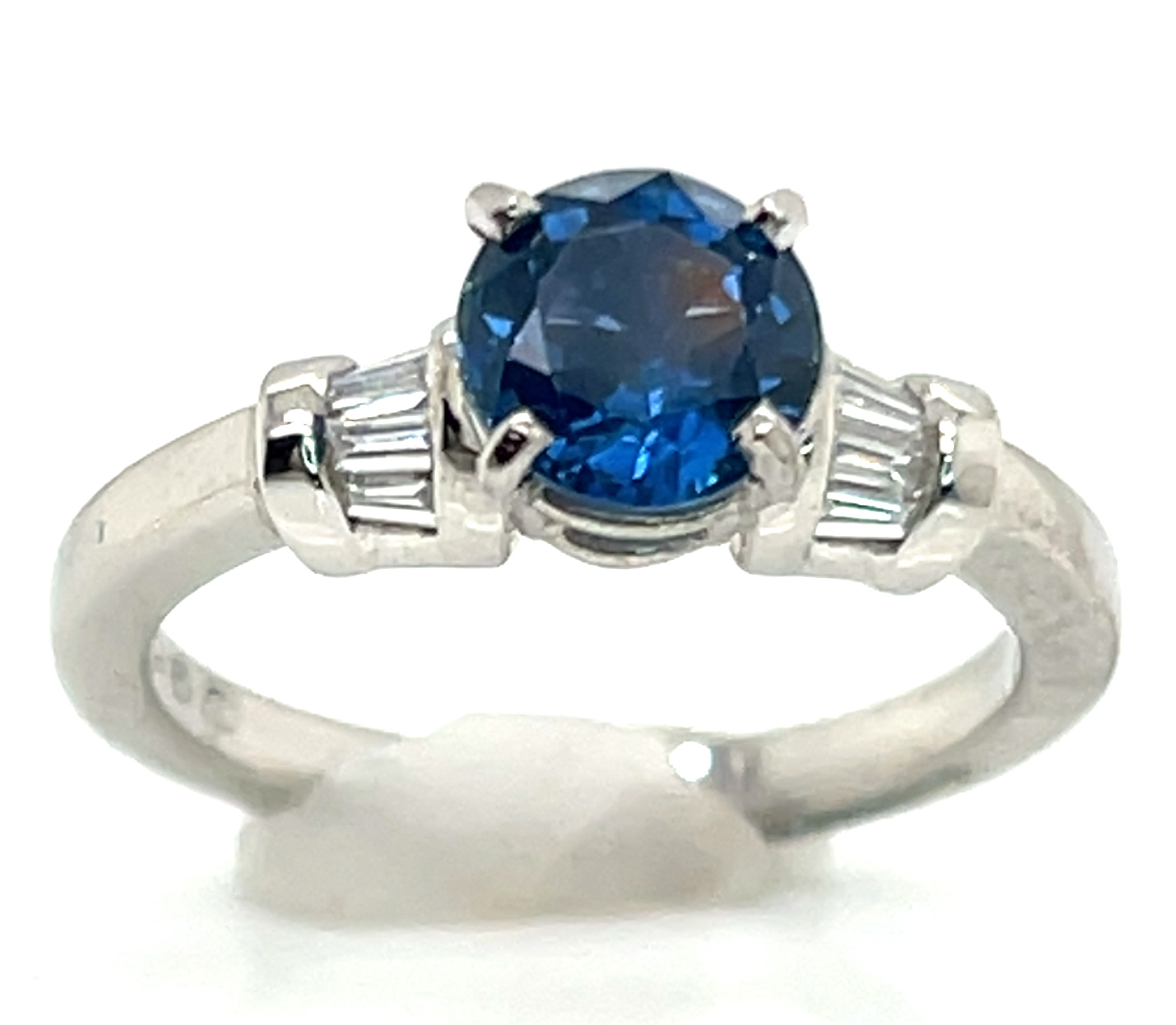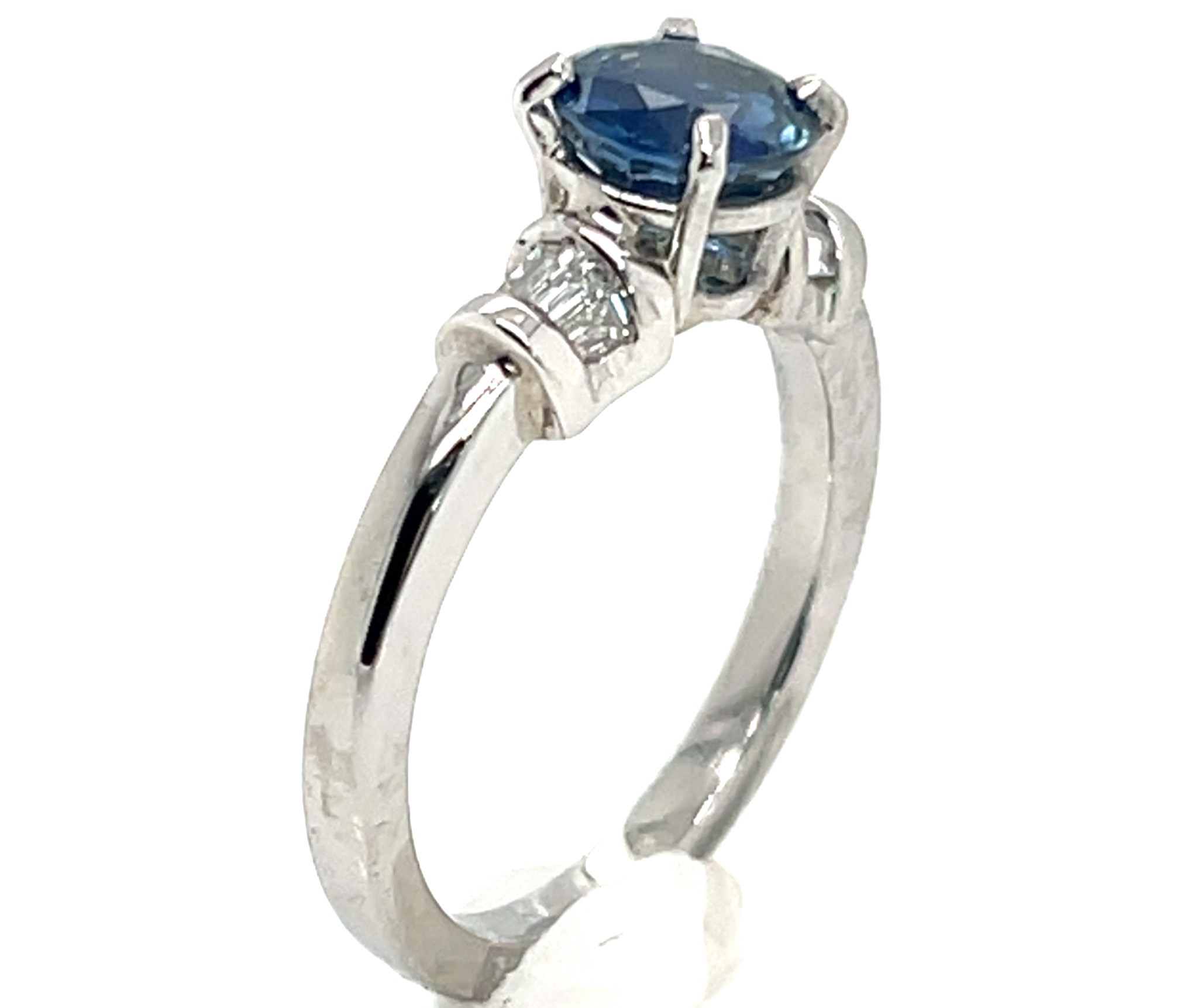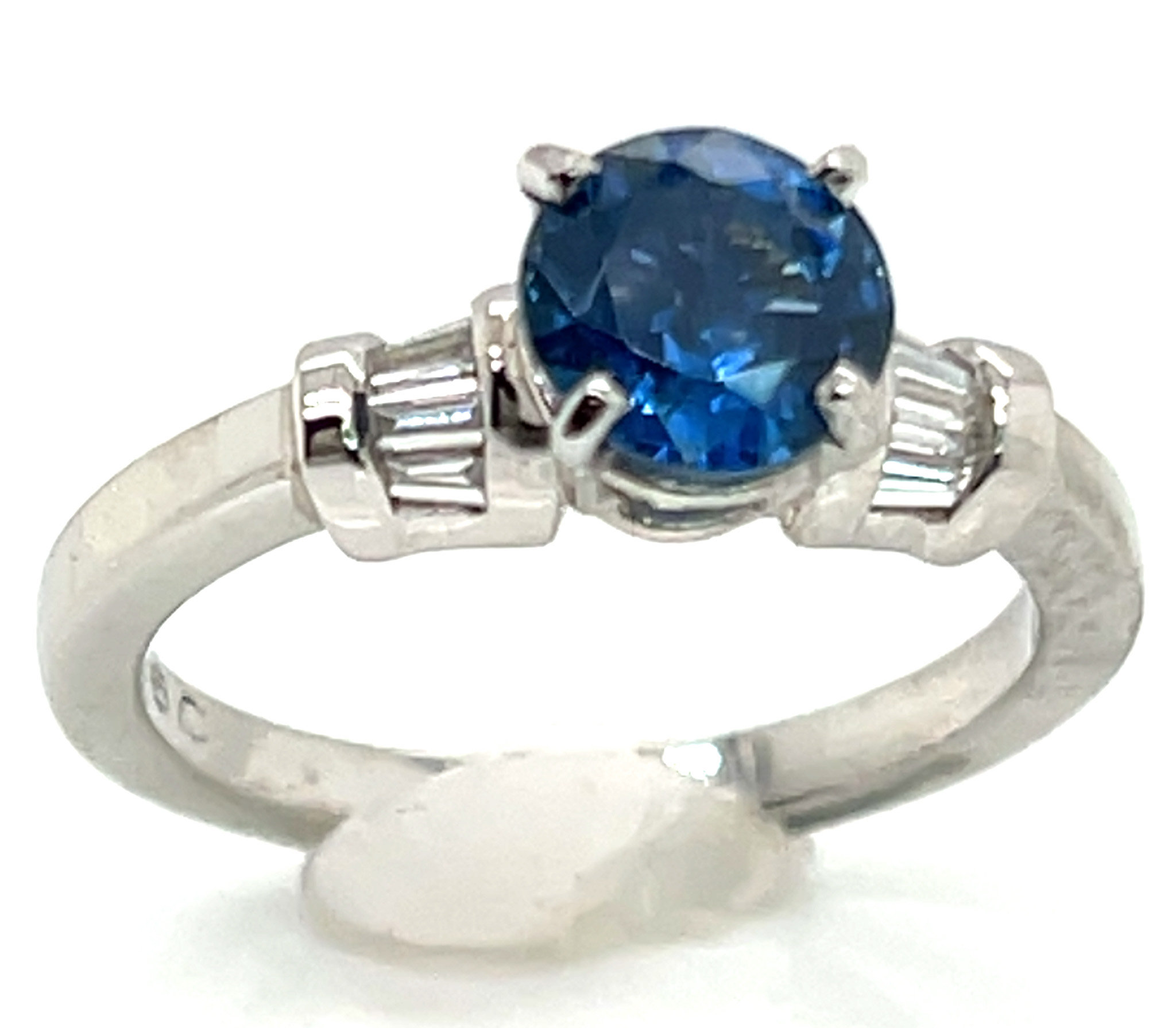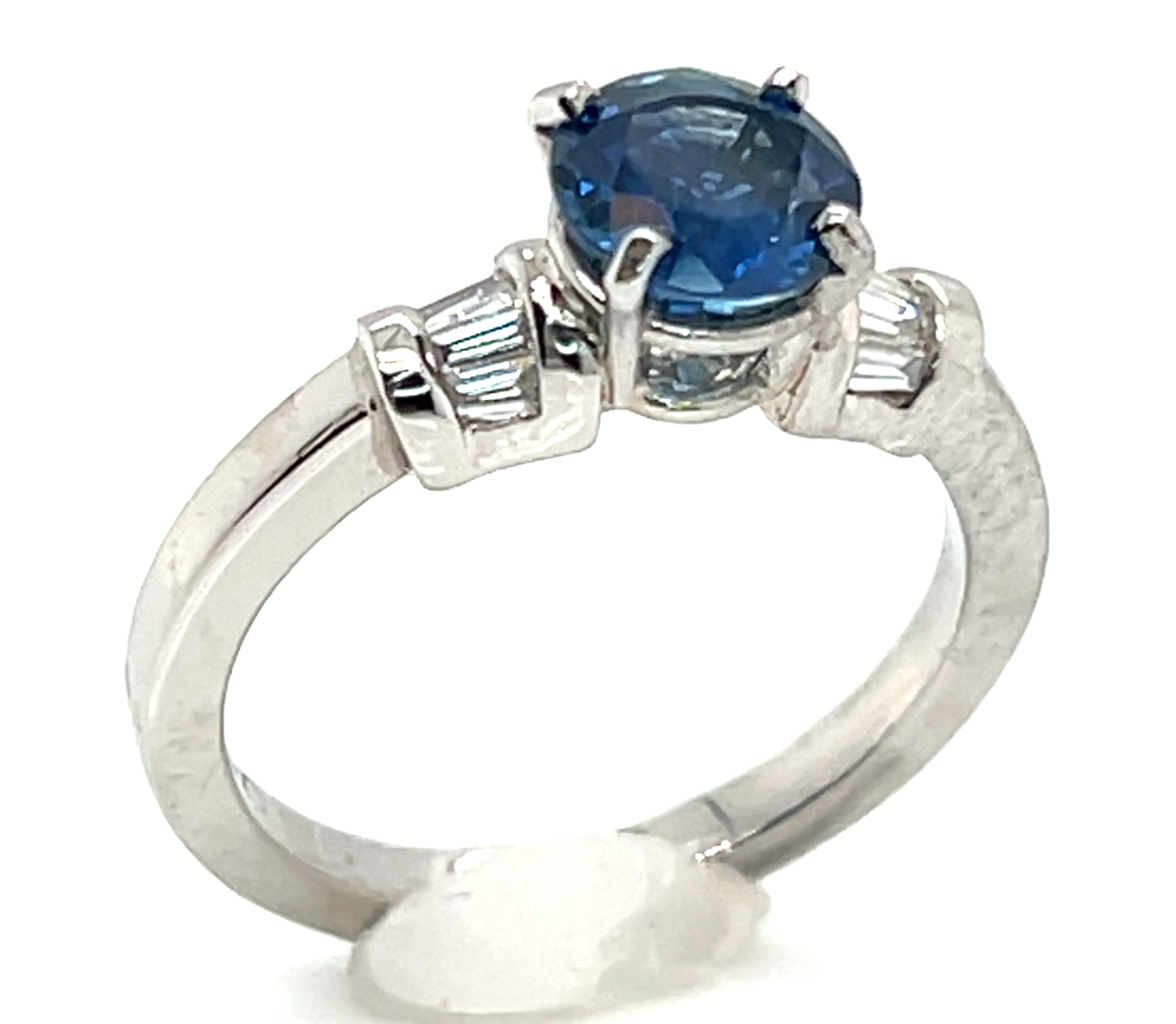 The sapphire weighs 150 carats, measures8 X 4.5mm and is prong set. On either side of the sapphire are prong/bead set round brilliant diamonds that line the ring’s shoulders and are 0.33 carats total weight and SI2/3 GH quality. The ring is made with 2.80 gram of 14KWG and is a size 7. Resizing options are available, see below.