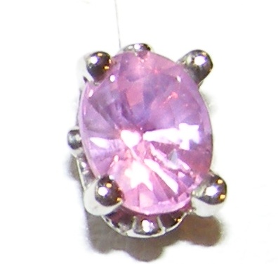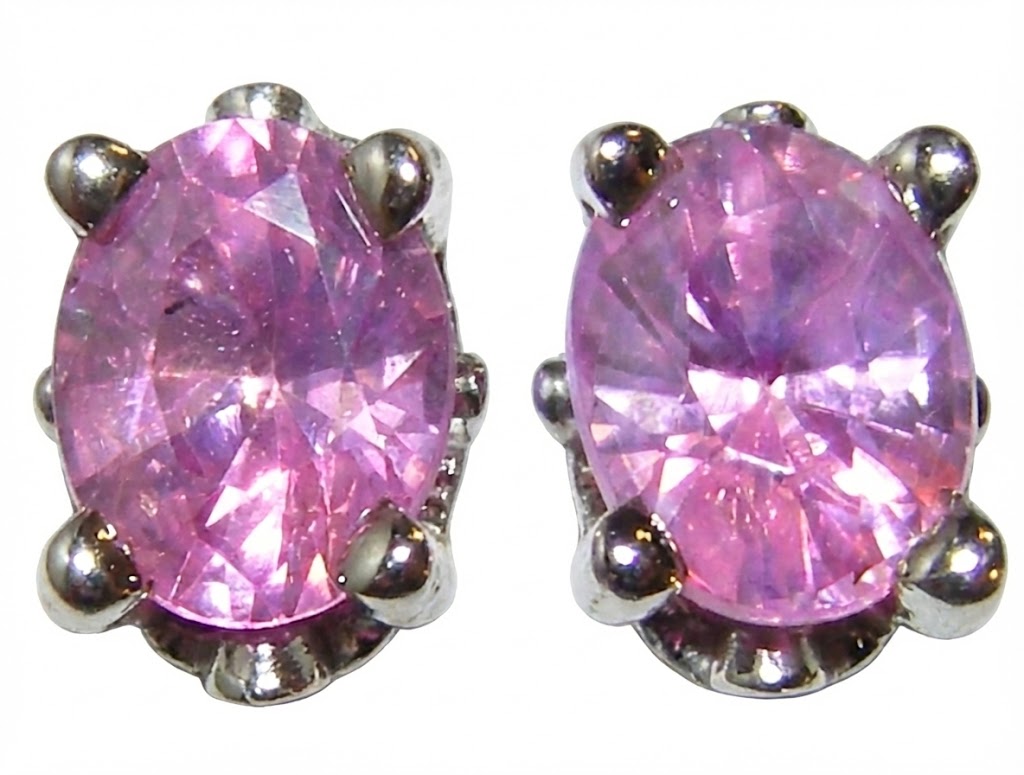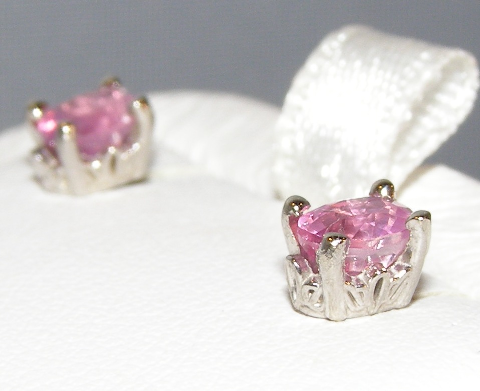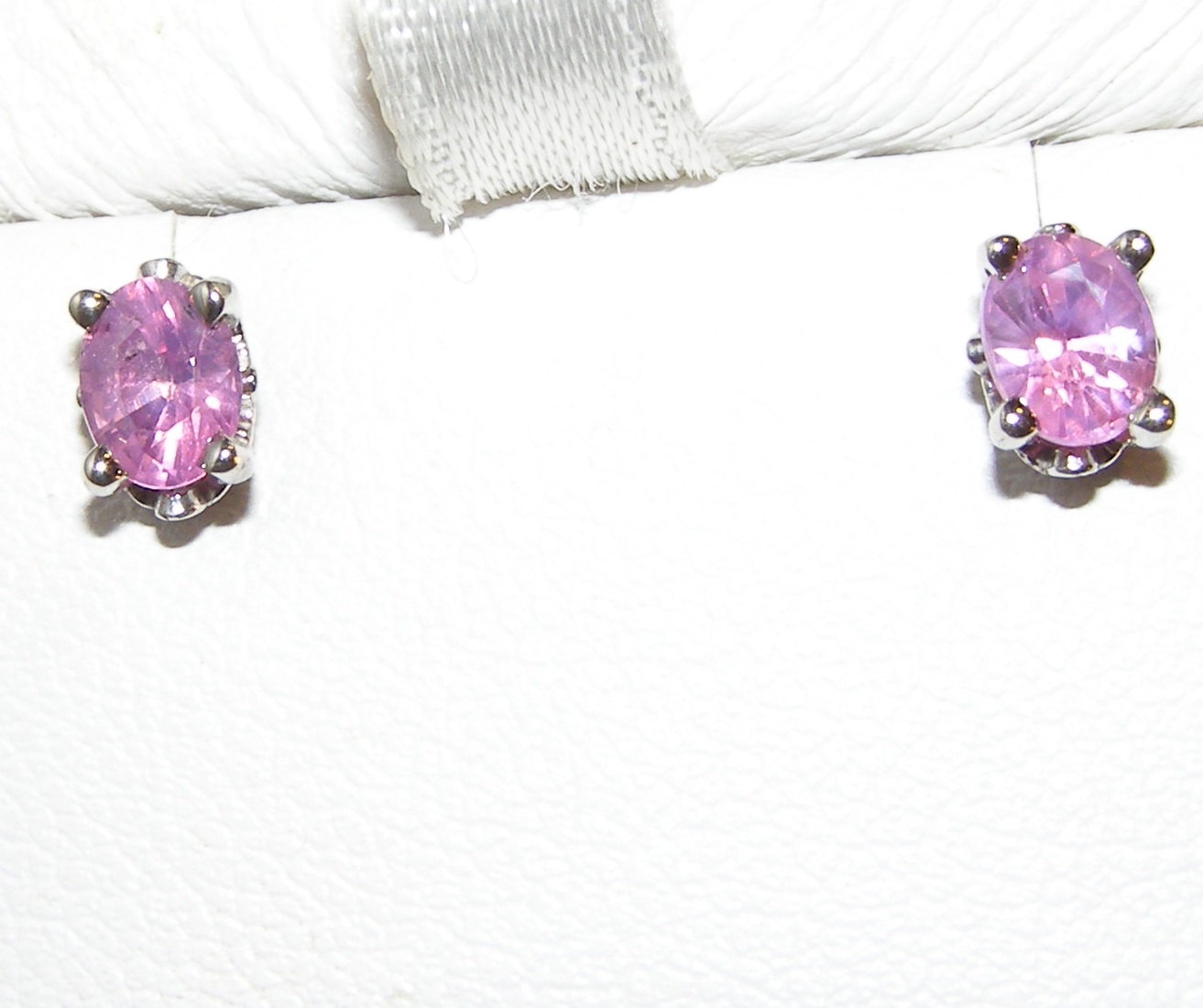 Super bright pink color is displayed by this pair of Ceylon pink Sapphires that are 0.94 carats total weight. Each sapphire measures 4.8 X 3.7 mm and they are prong set in elegant 14K white gold scroll mountings. The pink sapphires have a medium to rich color, eye-clean clarity, oval brilliant cuts and bright pink brilliance with both pink and violet sparks noted.